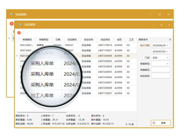 全面支持鉆石、金、銀、翡翠、玉器、普通、鑲嵌飾品等,滿足珠寶銷售行業(yè)銷售多種類型飾品的需求。可管理到禮品兌換,貨品換貨,舊金回收,舊金換新品,飾品鑲嵌、組裝等以及維修入庫、出庫等其它出入庫。